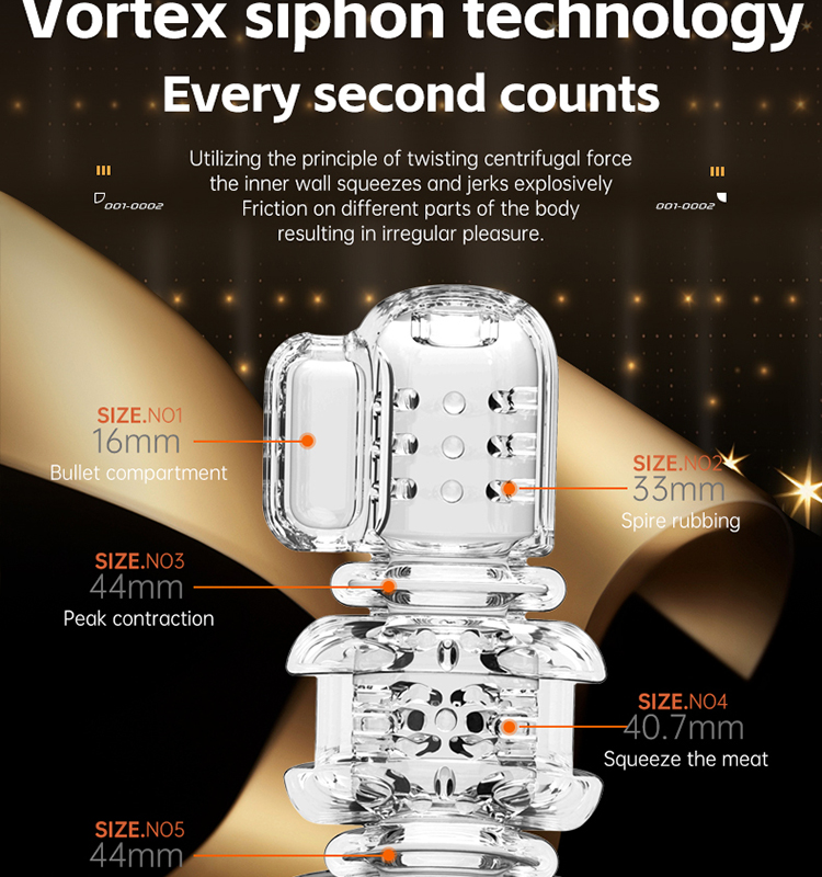 เทคโนโลยี Vortex Suction แบบใหม่ ใช้หลักการแรงเหวี่ยงหมุนเวียน กำแพงด้านในจะบีบและสั่น สร้างแรงเสียดทานกับอวัยวะเพศชาย เพื่อมอบความสุขที่ไม่เป็นไปตามรูปแบบเดิม
