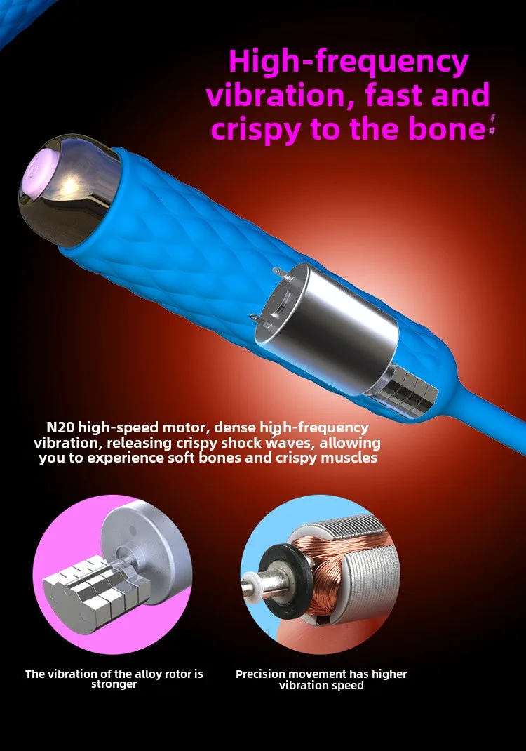 มอเตอร์ N20 ความเร็วสูง กลไกความแม่นยำ 3 ระดับความแรงสั่นสะเทือน 7 ความถี่การสั่นสะเทือน หัวเรียวโค้งมนสอดใส่ง่าย ด้ามจับลายคลื่นสัมผัสนุ่มสบาย กันน้ำระดับ IPX7 วัสดุซิลิโคนผิวสัมผัสเนียนนุ่ม เงียบสนิท